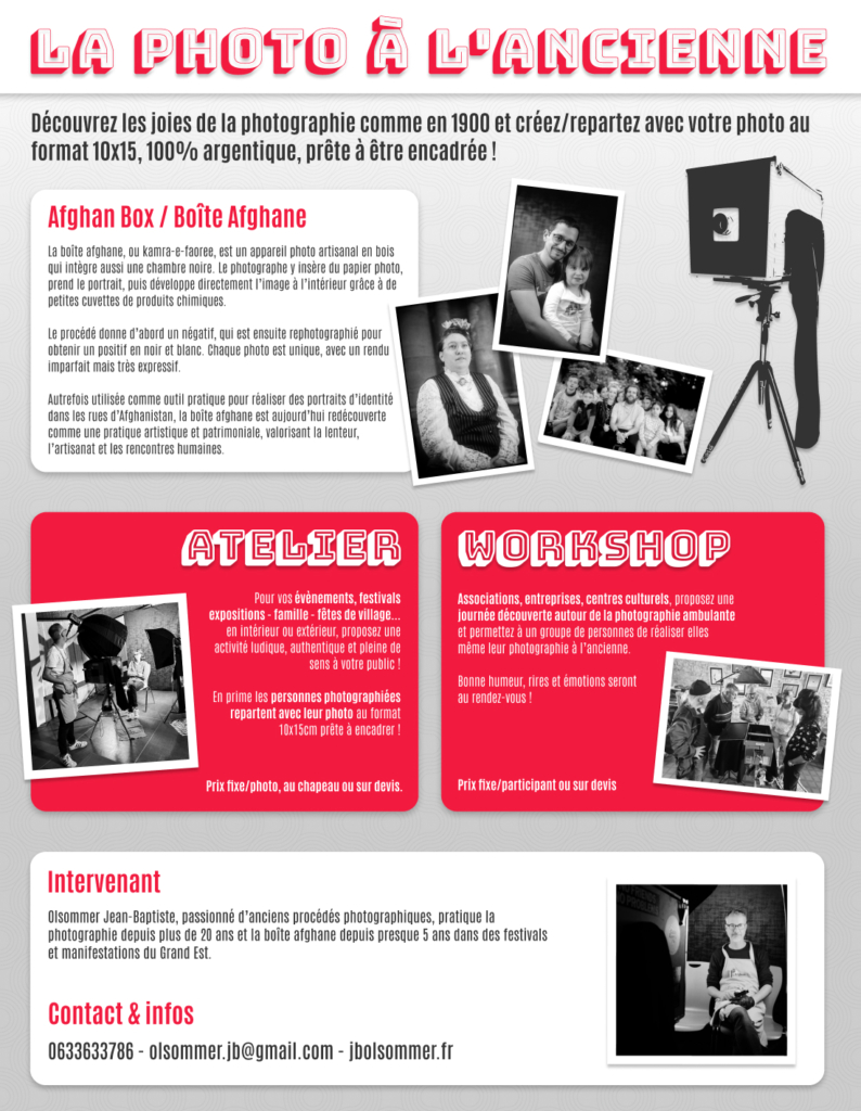 Je me déplace également dans les entreprises, associations, les Mjc, les centres sociaux et culturels pour faire découvrir cette magie de la photographie à l’ancienne.